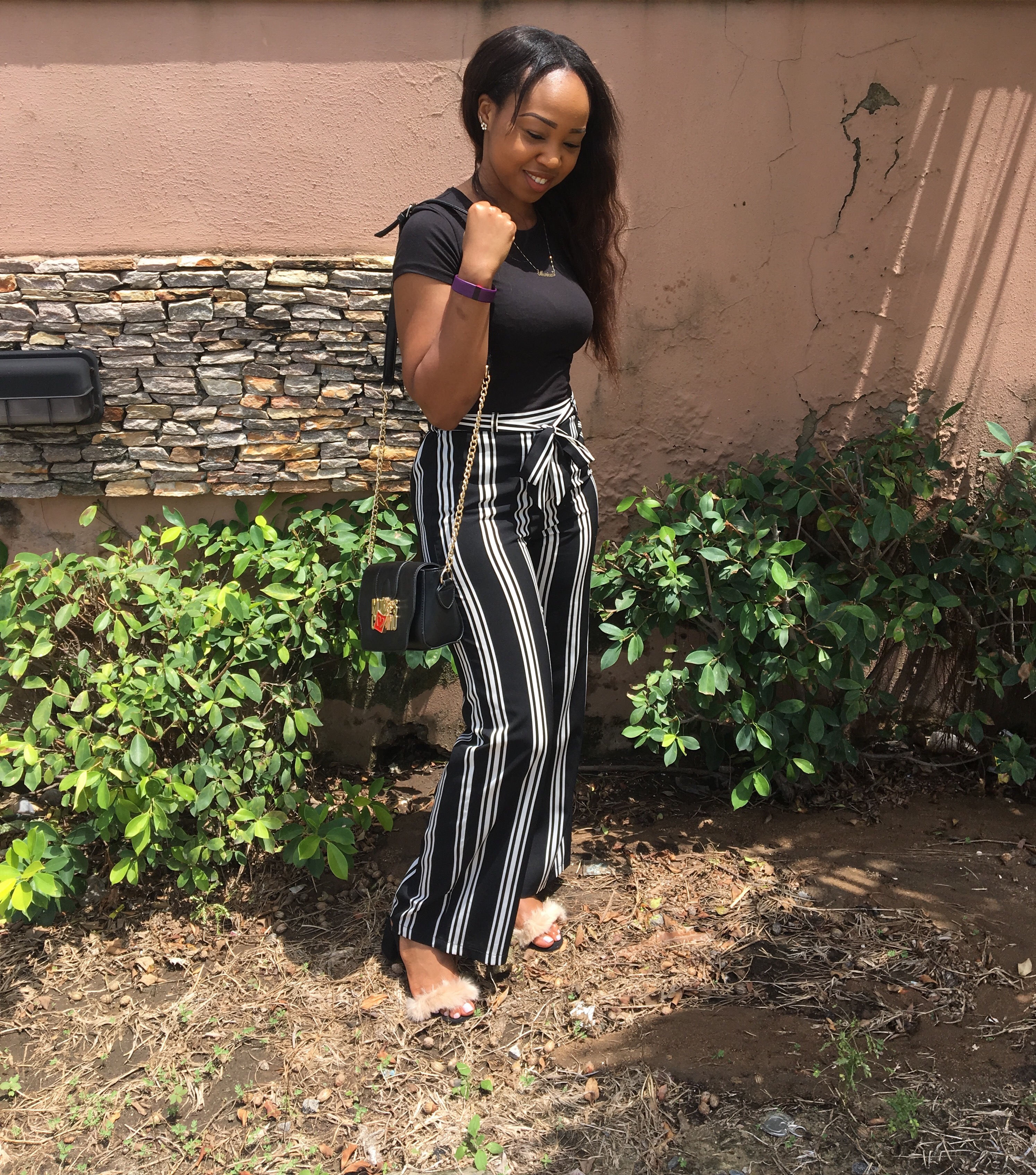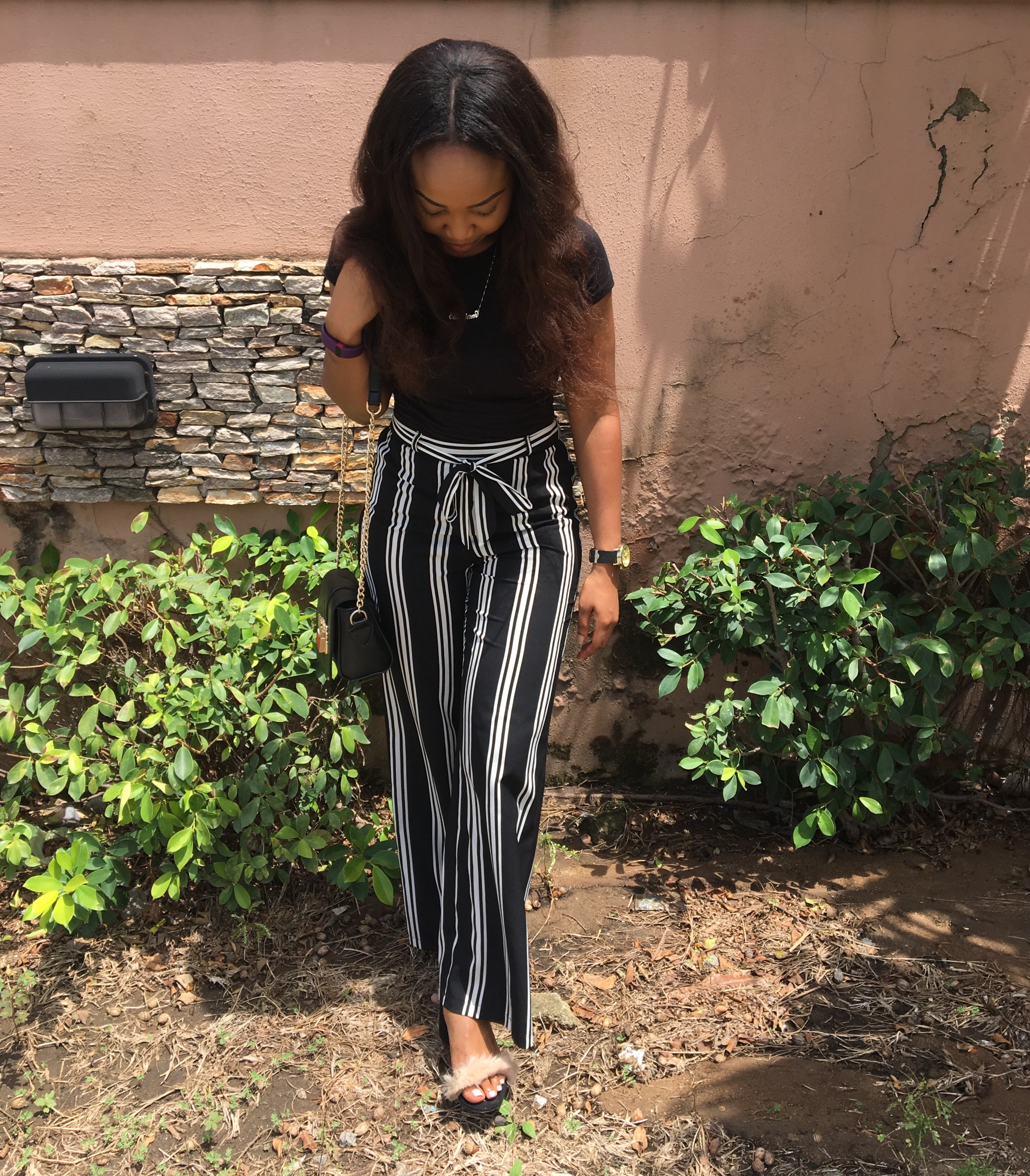 I paired the pants with a basic tee, black fur sandals I wore here and a black purse. I decided to go black on black for my first look with the pants. Besides the fact that black is one of my favourite colours, it’s always an easy option.