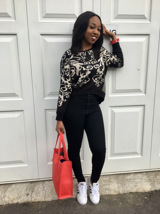 I have on a sweater, high waisted denim and sneakers. I traveled to London in a rush late September. It’s autumn here but it’s already freezing and I took off my jacket to get these photos in quickly.