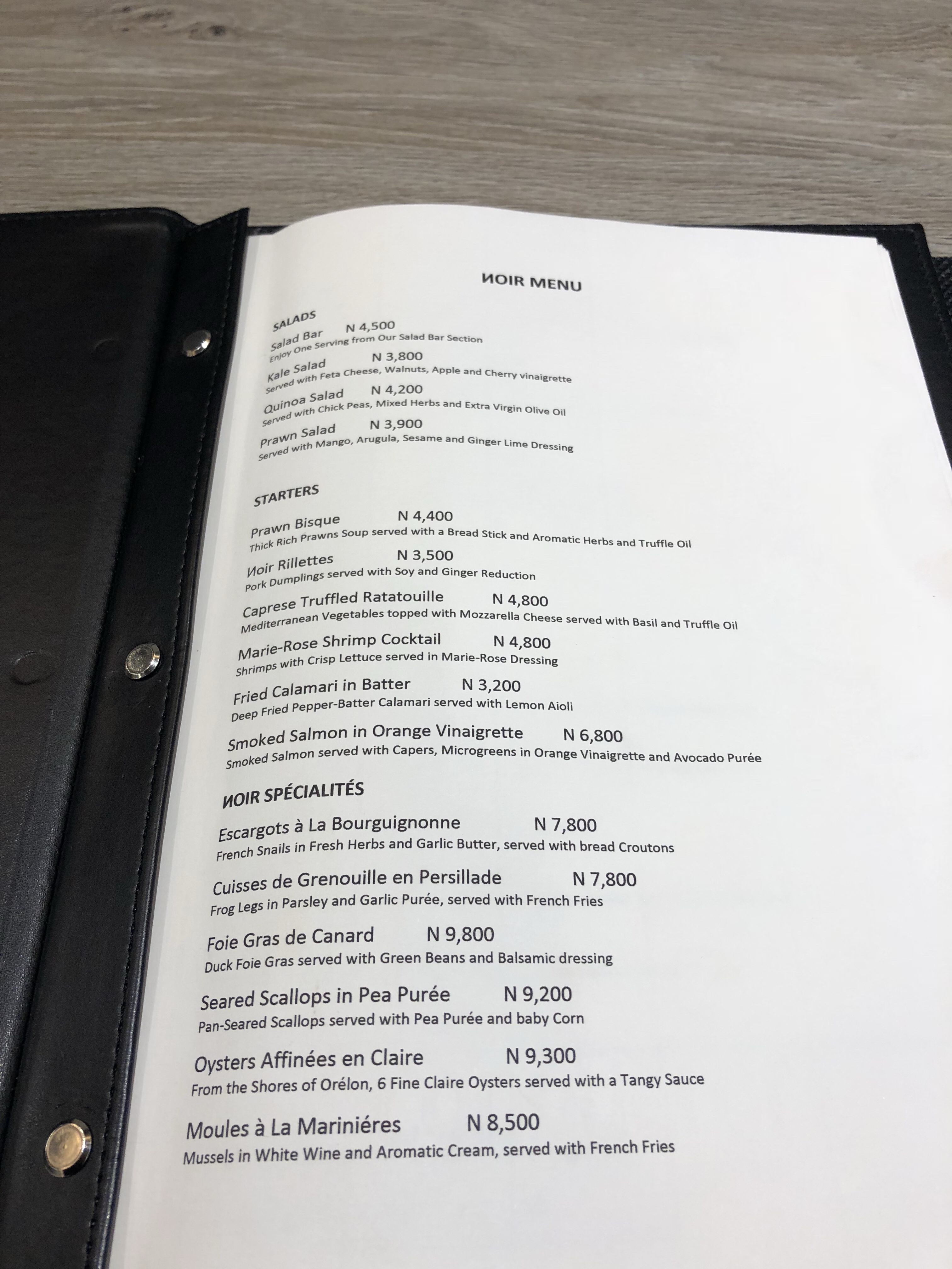 Noir Lagos is a french restaurant located in the heart of Victoria Island, Akin Olugbade precisely. It stands beside one of my favorite bbq places BBQRUS and is directly opposite Art Café talk about competition or confidence. The first thing I noticed was the lack of ample parking spots. Luki was worried he would be called to come and move his car but someone was leaving when he was trying to park so we took their spot.
