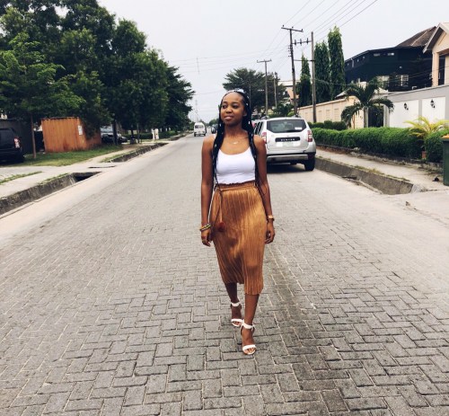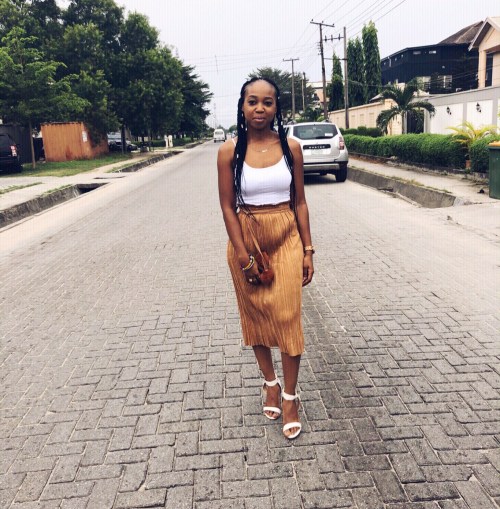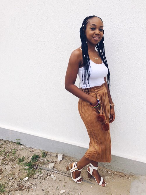 I like this skirt particularly because it hugs the waist, the colour isn’t too bright but it’s still pretty and the fur detail belt is too cute. Paring it was very easy too maybe because I didn’t try so hard. I just threw on a white cami and it came alive. I initially wore brown slippers but it felt like the look wasn’t complete so I decided to switch to my rarely worn white shoes which definitely complemented the outfit.