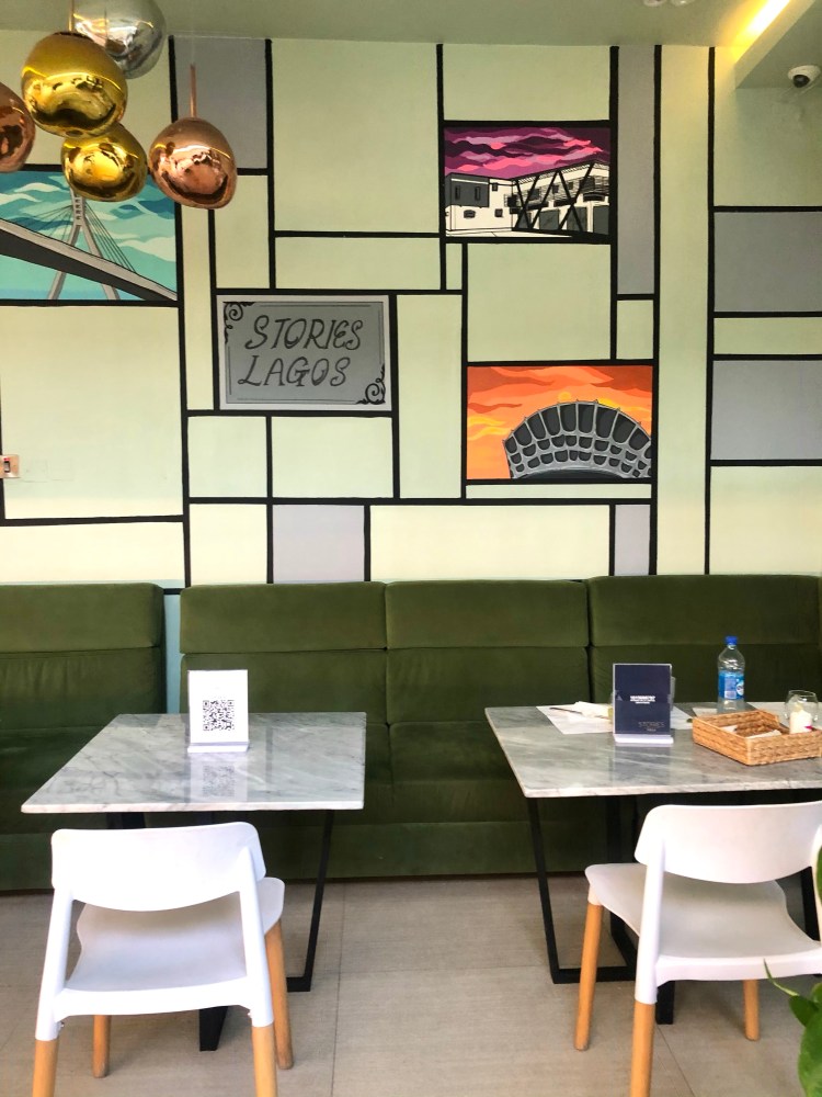 The restaurant occupies the ground floor of the building and has both outdoor and indoor sitting areas. Sitting outside wasn’t an option because the weather wasn’t friendly so we walked in. I especially loved the greenery in the space, the decor and the paintings of Lagos monuments and iconic buildings. I was in Stories Lagos after all. I also like the cutlery detail in the display of the name. Isn’t it so cute?