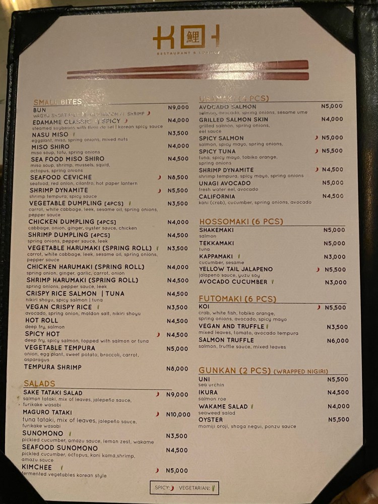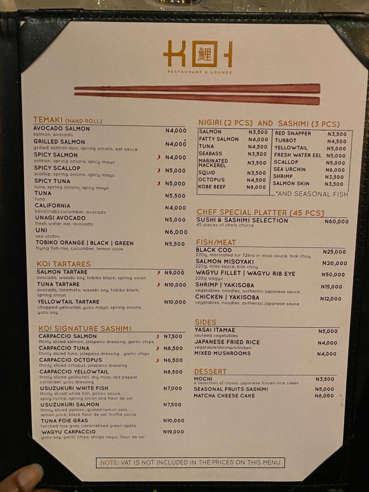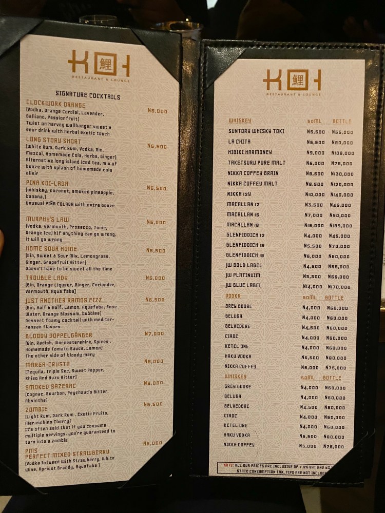 Koi Restaurant & Lounge is a perfect place for date night if your pocket is heavy. It’s also a good spot for business and client meetings if the menu above is within your budget. I especially loved the vibe and feel of the space, and its ability to take you away from the hustle and bustle of Lagos. I believe it is a restaurant that will stand the test of time.
