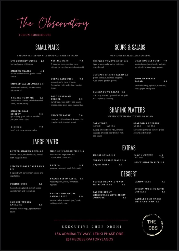 The Observatory is a fusion smokehouse located on Admiralty Way, Lekki Phase 1, Lagos.
