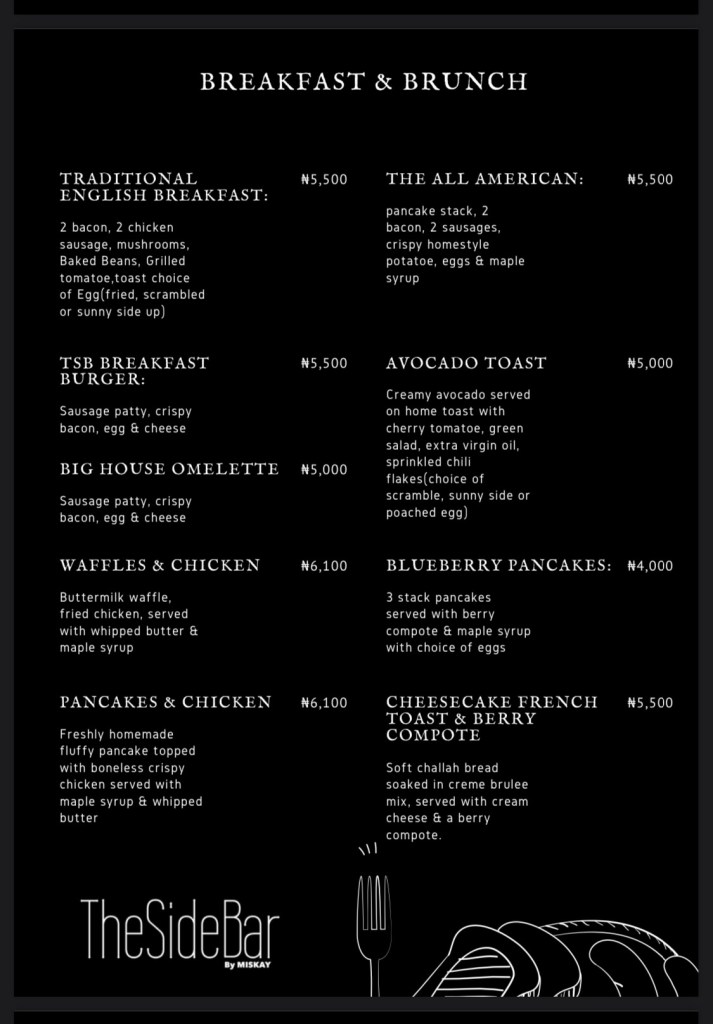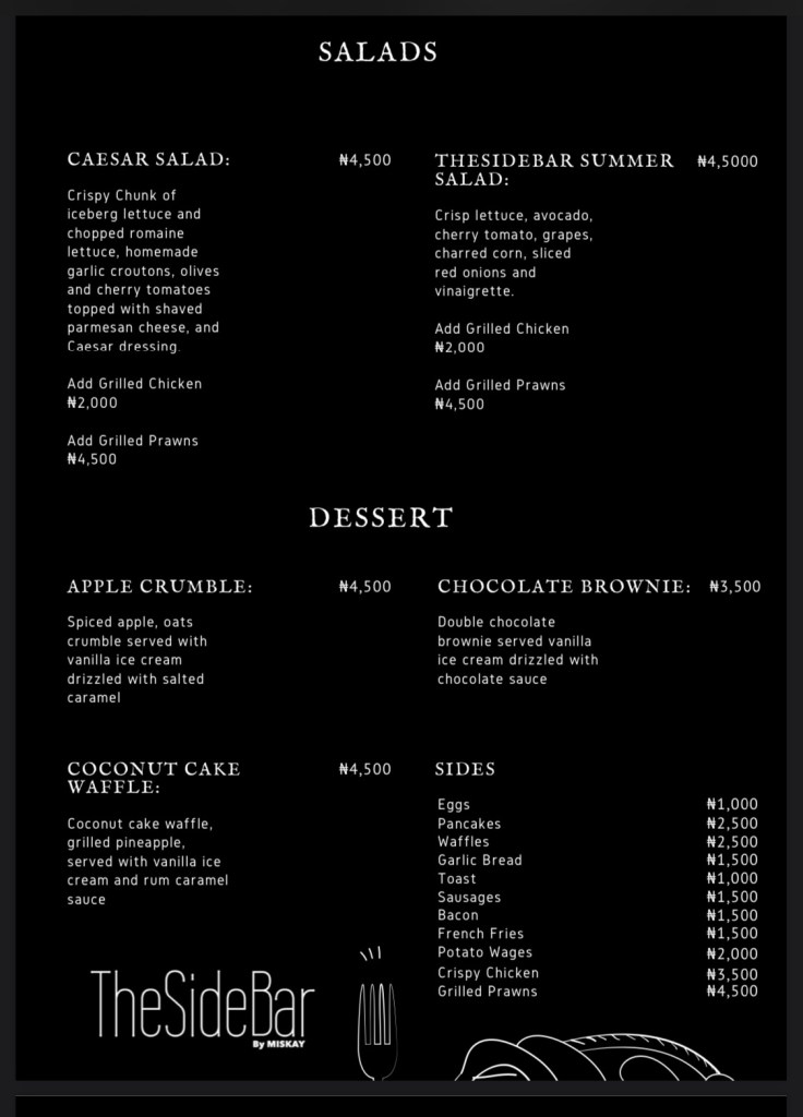 Our waiter came by immediately we were sat to serve us. We were offered milk options to choose from for our drinks, and they didn’t just assume that we preferred cow milk. The restaurant observed all covid-19 protocols and we never looked for our waiter. On the downside, because the restaurant is a long stretch, there’s no private corner. It’s not a big space, so it’ll be advisable to call ahead if you’re a large group. The Side Bar shares parking with the store, so you may have to move your car for other customers if you park behind a car. On the flip side, you get to see customers shopping while eating 😀