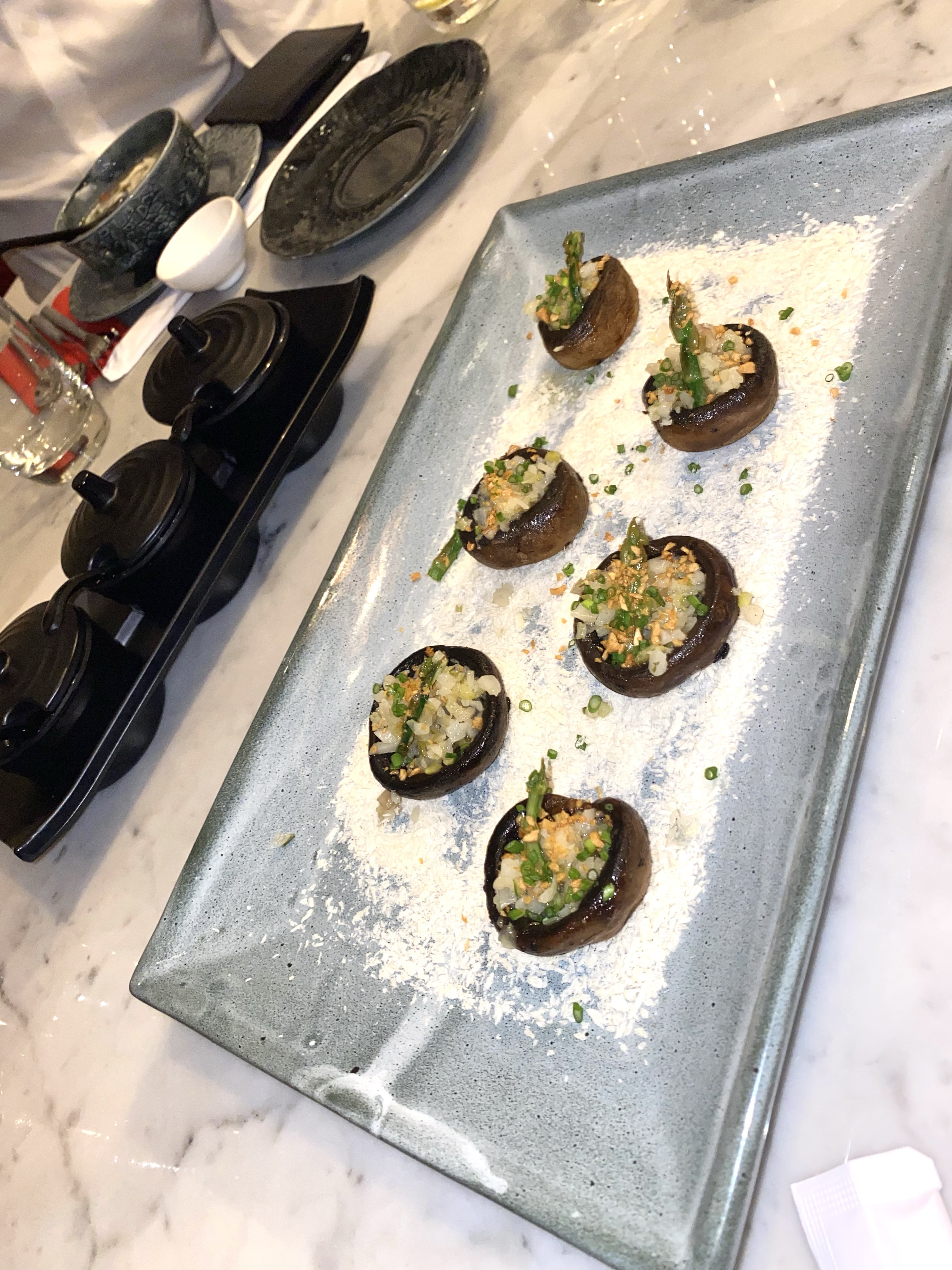 For starters, we chose Chilli Crab Meat Soup, Lemongrass and Coriander soup, Chicken/Prawn Suimai (dim sum), Asparagus Tempura and Truffle Butter Mushroom.