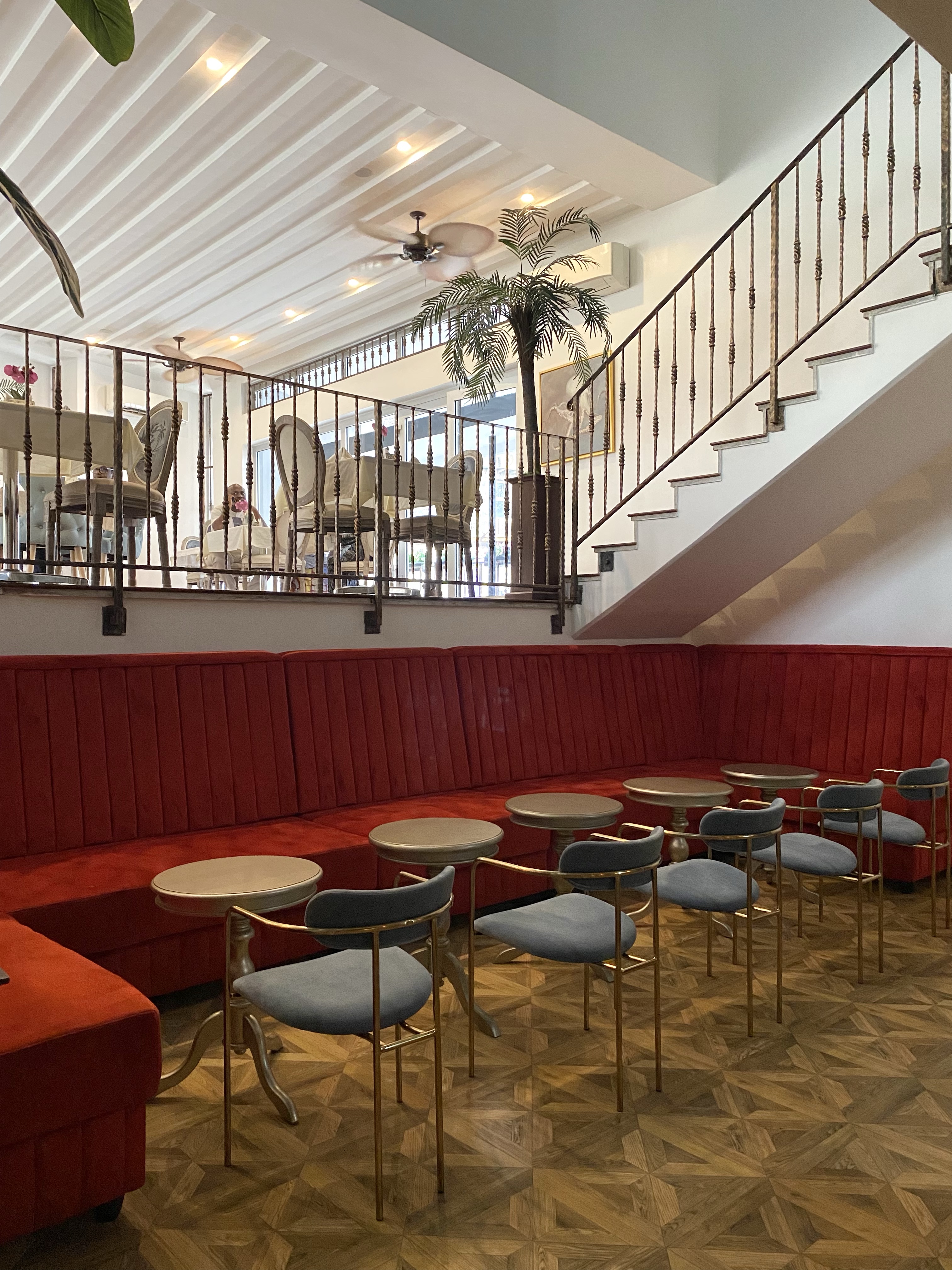 We could tell that an old house was converted to a restaurant from the outside. As soon as we walked in, we got a cosy and inviting feeling. There’s a waiting area where we were asked if we had reservations before we were ushered in. The space is pretty with a combination of colours and furniture that gives an old (antique) vibe. There are three sitting areas indoors (by the bar, opposite it and up the stairs), and then there’s a sitting area outdoor (down the stairs) which I love. The purple details are too pretty, and I just had to dine there.