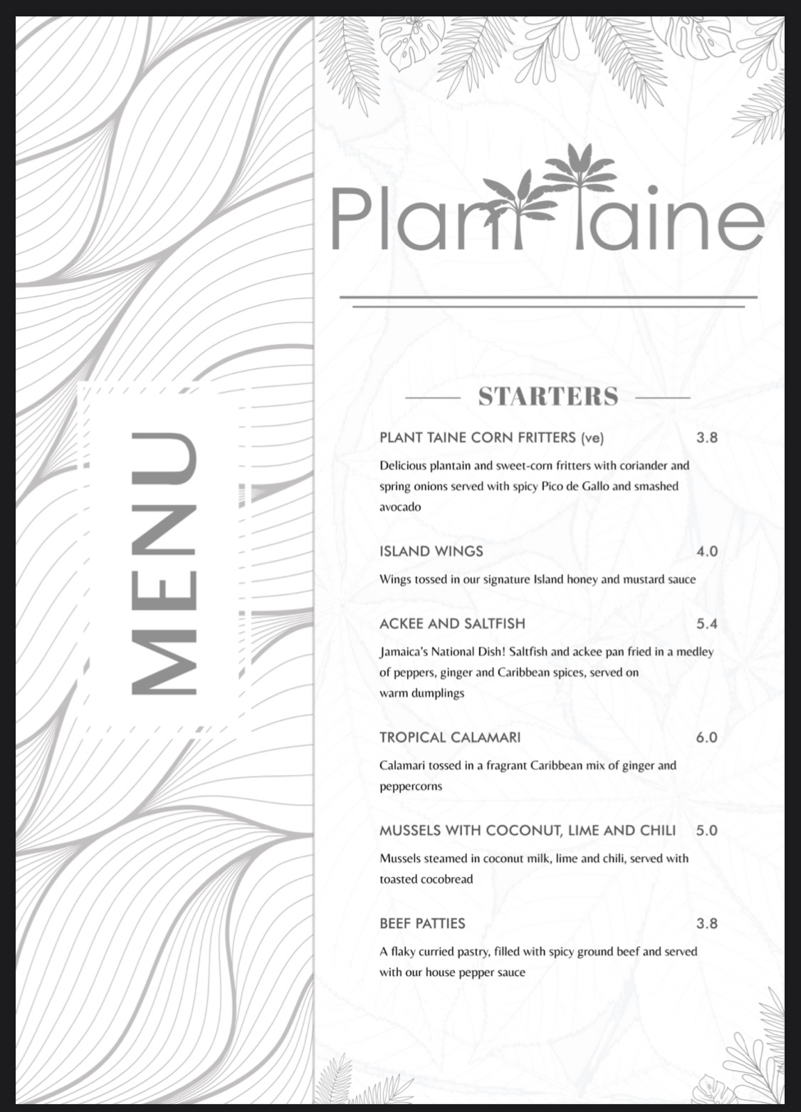 For drinks, we chose Jamaican Mule, Soda Water and regular water. Then, we chose Plant Taine Corn Fritters to start and Curry Goat, Jerk Lamb and a side of Plantain for mains.