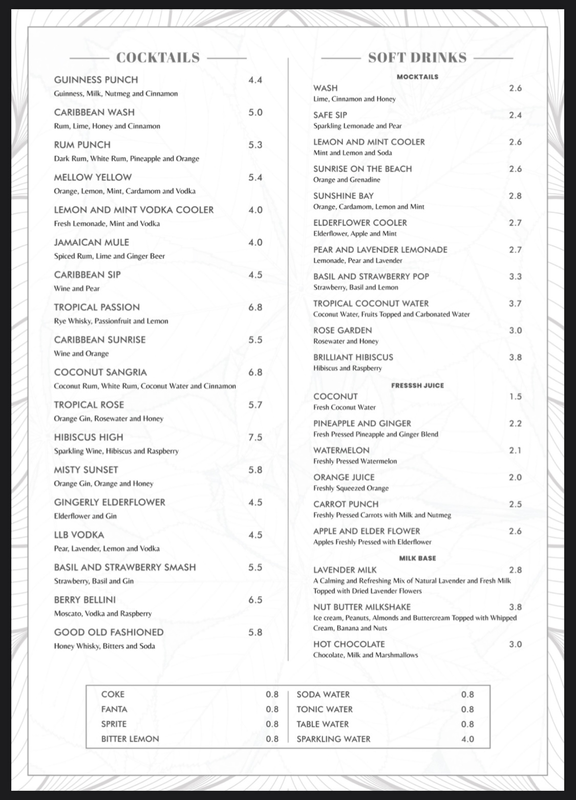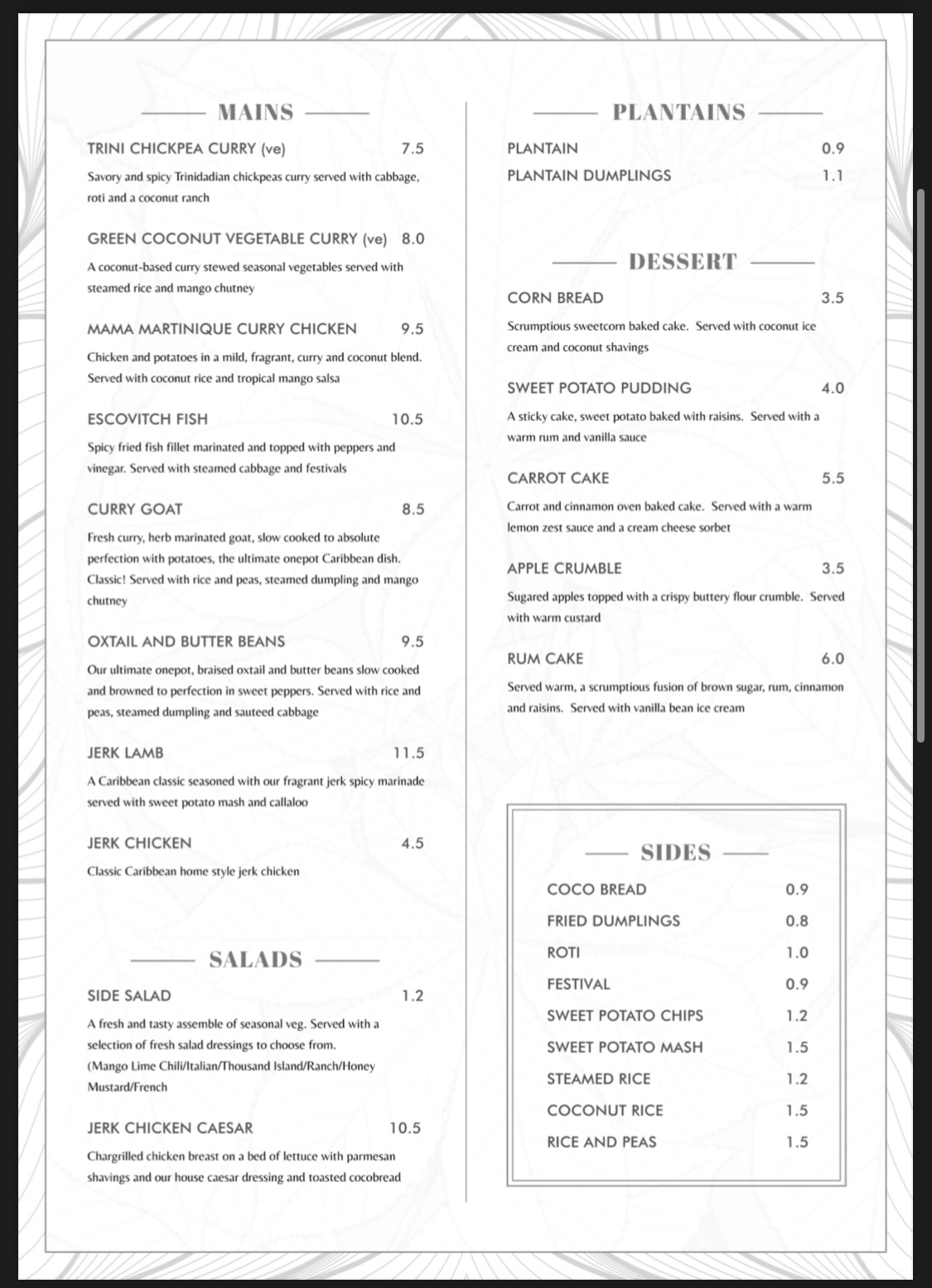 The food menu is organized into six categories. There aren’t a lot of options, but it’s enough to choose from. The prices are affordable and not as overpriced as the new restaurants on the block. The drinks menu also has some interesting options with an obvious Caribbean twist.