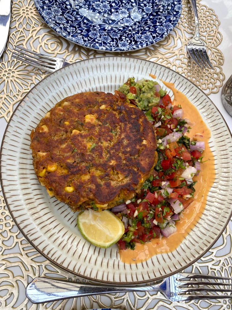 Moscow Mule is one of my go-to cocktails, so I thought Jamaican Mule wouldn’t be too far off. Unfortunately, I wasn’t impressed with the cocktail. It tasted watered down, and I was happy A thought so too. The Fritter was sweet and filling, and the vegetables it was served with were fresh and crunchy. We both liked it.