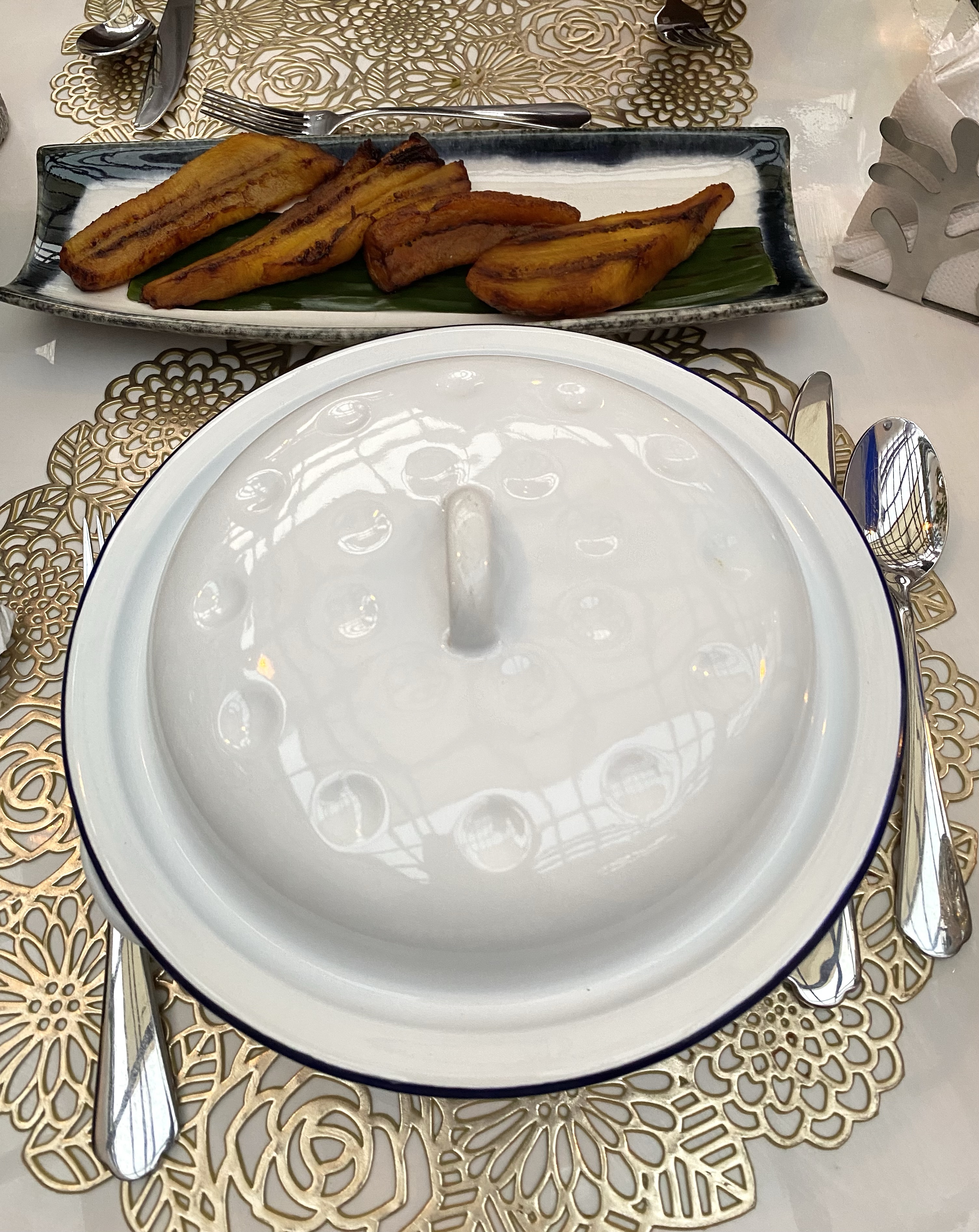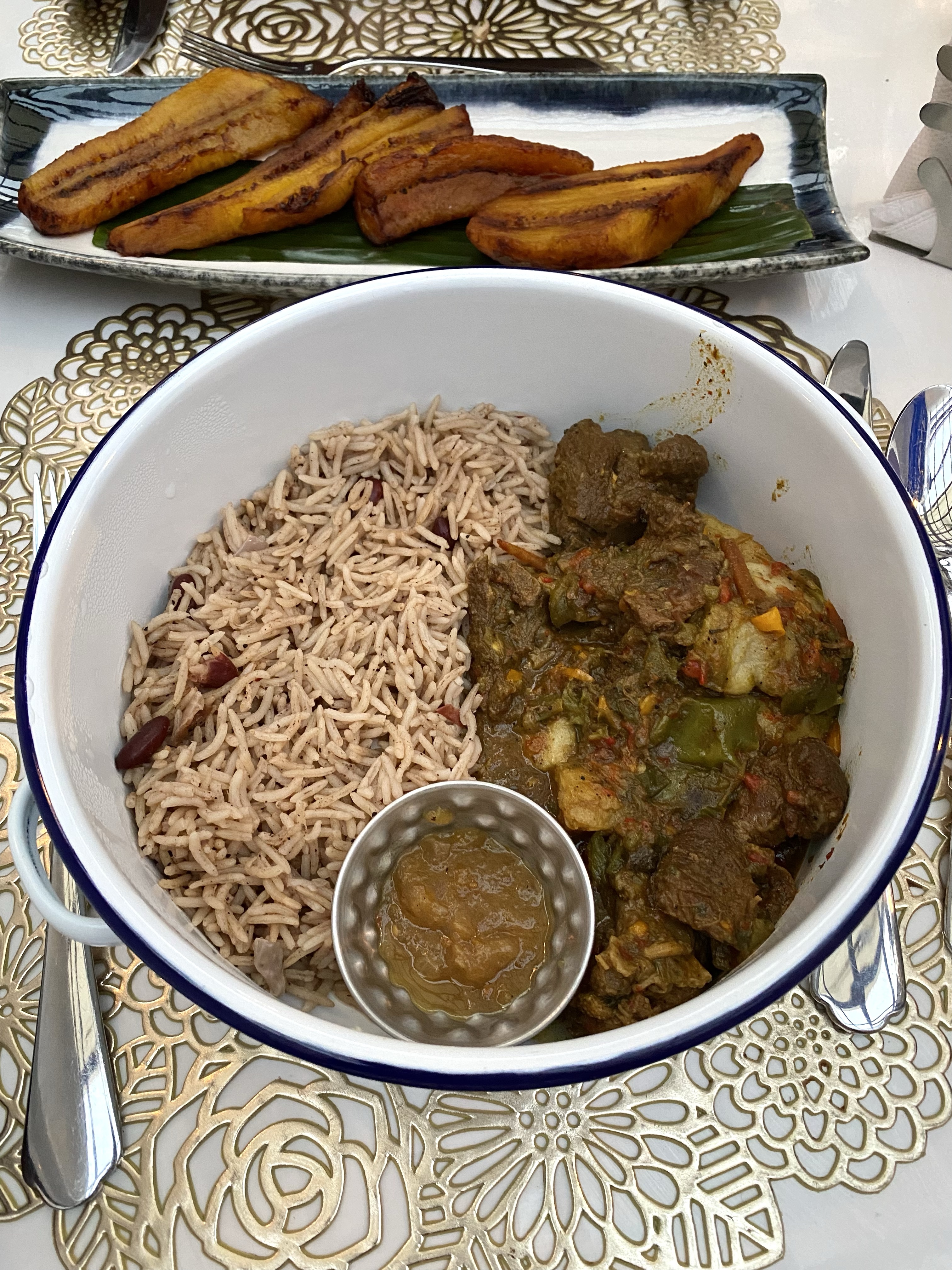 Our mains were served next. The Curry Goat came in a casserole dish, and I was excited to open it. When I did, the meal looked inviting, but I was disappointed about the portion. Trust me; the pictures below don’t show how small the serving is. However, it was spicy and yummy, and the rice and beans were perfect.