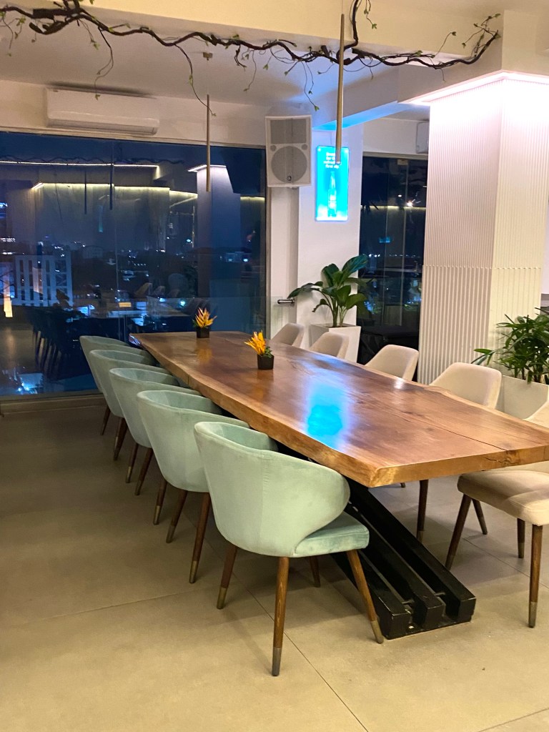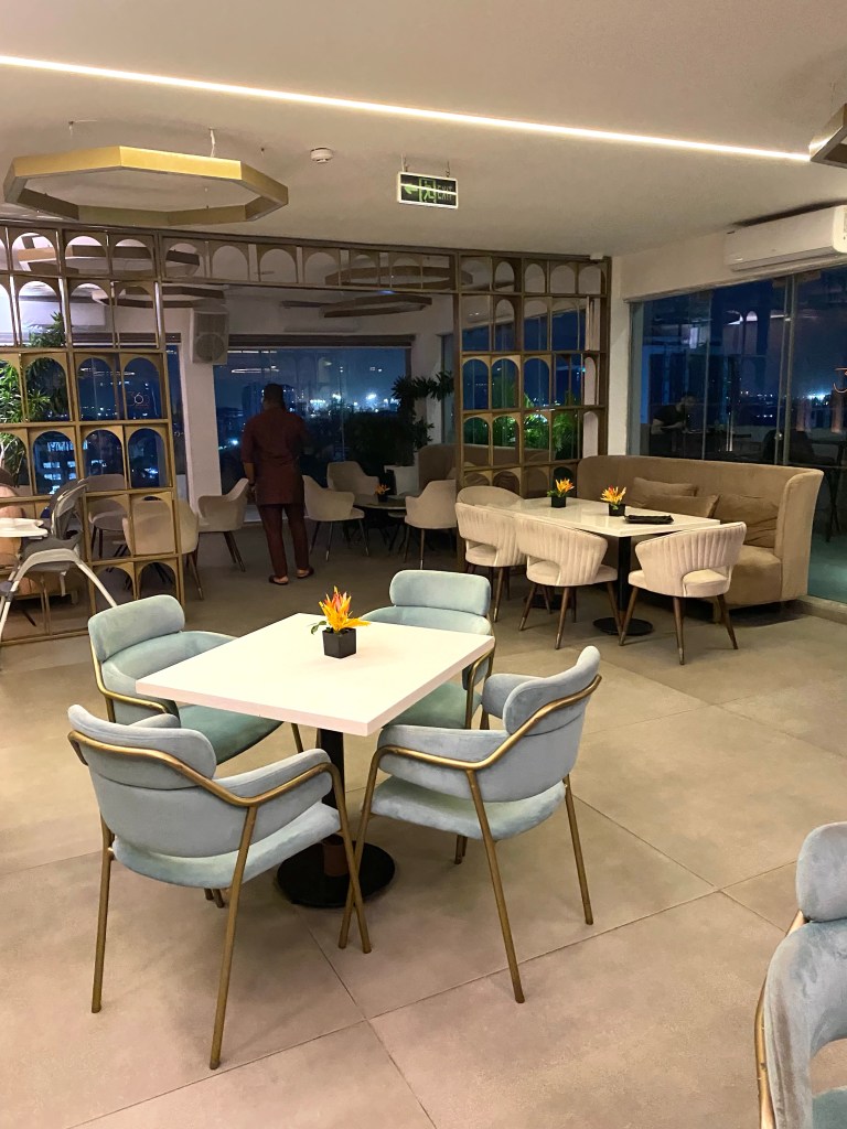 A lift takes you straight into the restaurant. It’s a bright space with blue, beige and gold coloured furniture decorated with a lot of greenery and unique light fittings. There are different sitting areas with a selection of high and low seats, depending on your desire. I remember looking out the window and realizing how beautiful the place must look in the day.