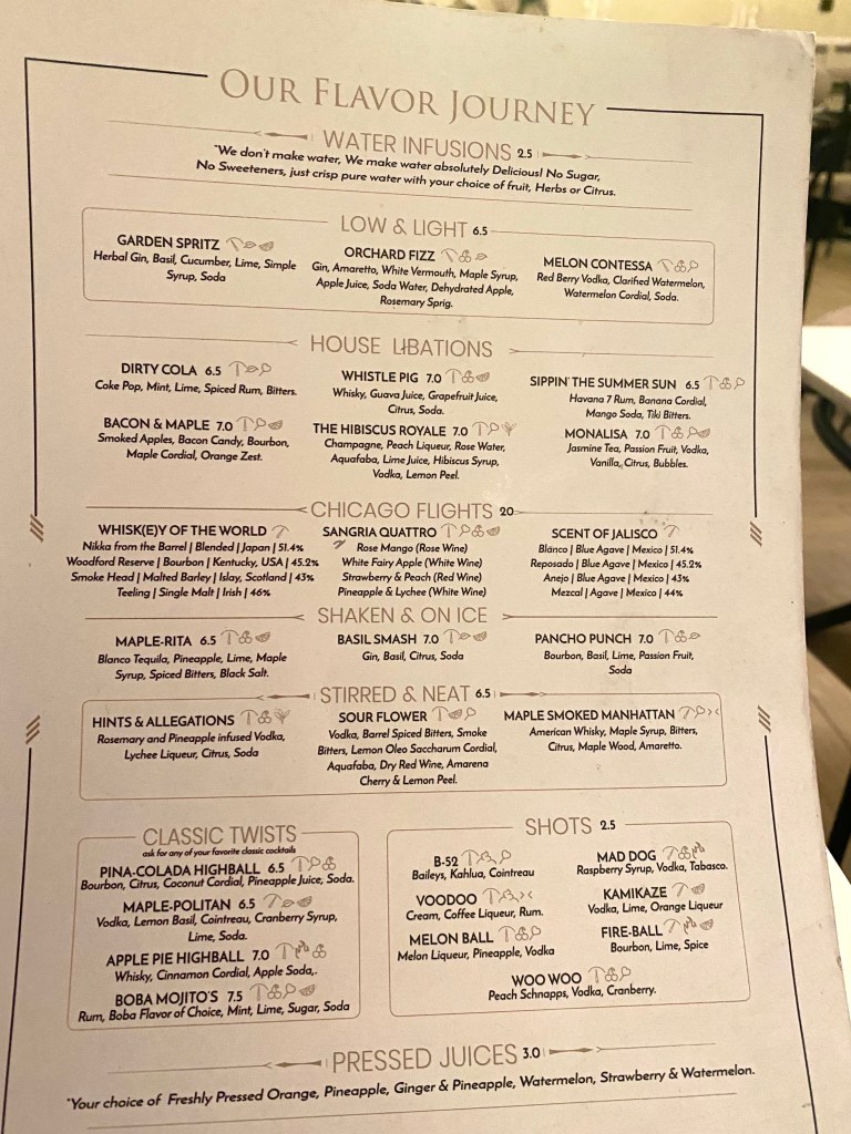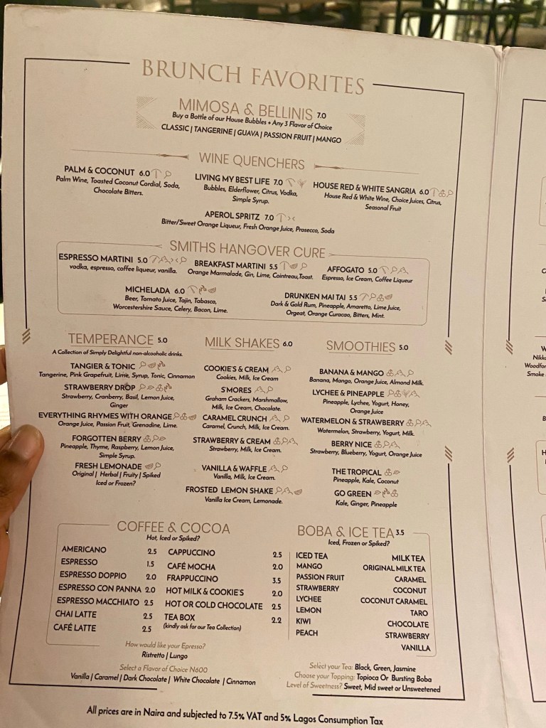 The food menu has over ten categories, with a selection of brunch and dinner meals for everyone. The drink menu is also rich with various options, including beverages and alcoholic and non-alcoholic options.