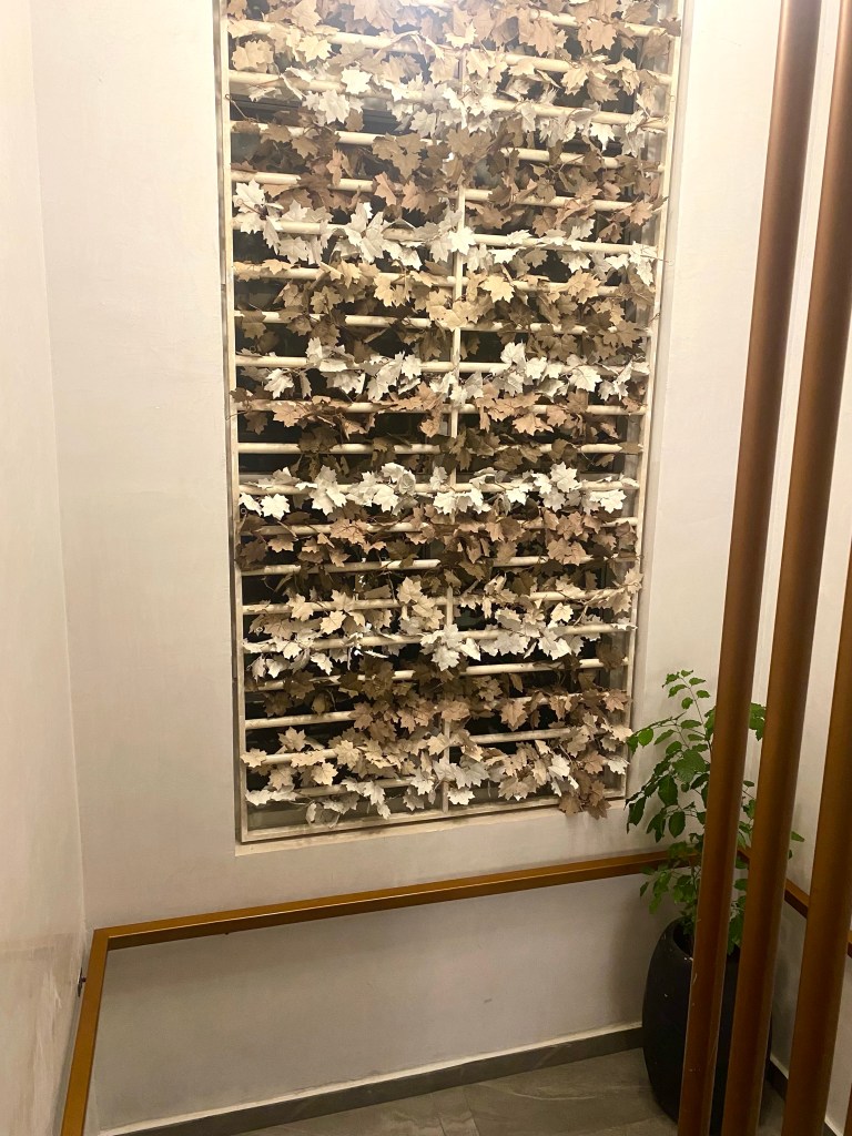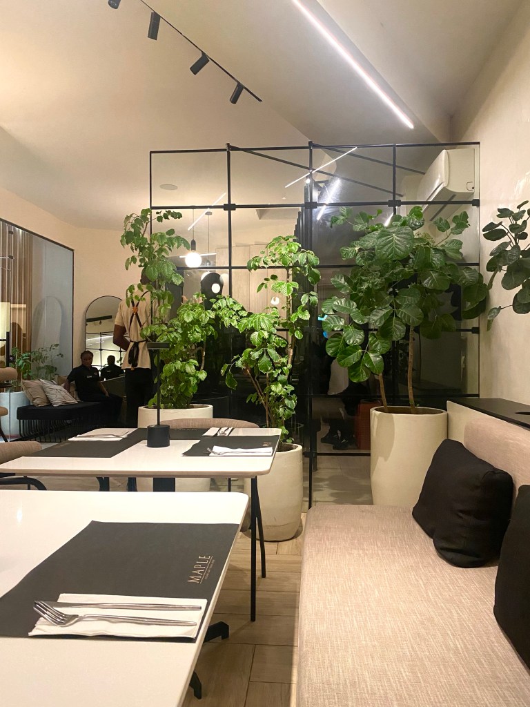 The restaurant has a cosy vibe; you notice this immediately after you walk in. The furniture is a mix of grey, beige and black, which perfectly complements the greenery. The space has three seating areas: the booth seats, the high seats in the middle and the bar seats. I especially like the maple leaves at the staircase and by the signage inside. The restaurant also has a private dining area for private parties.
