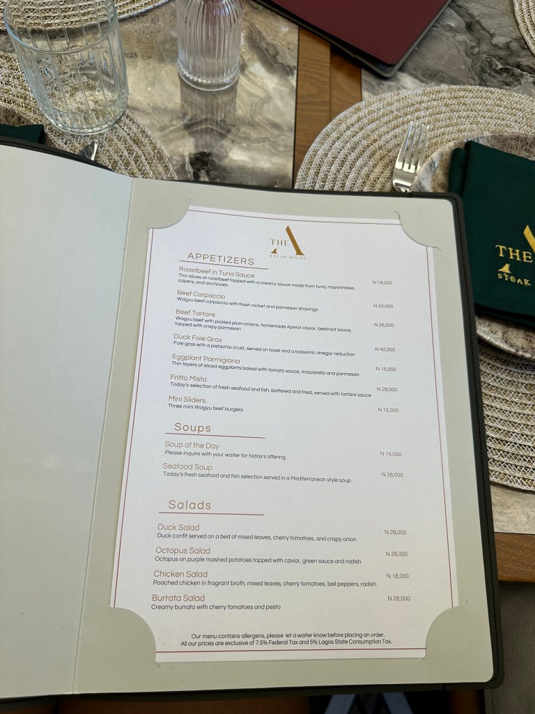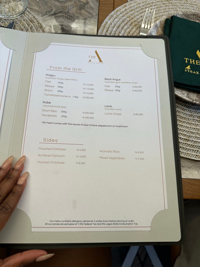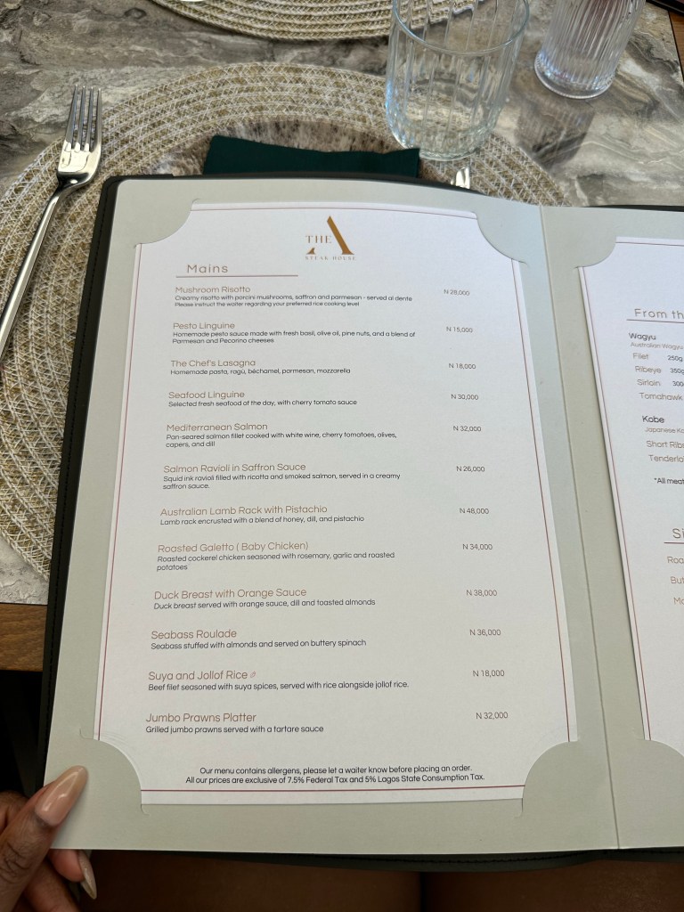The A Steak House is a new restaurant in Victoria Island, Lagos. It’s located in Karimu Kotun, where The Grill by Delis used to be. I stopped by The A Steak House with my family for lunch in November, and here’s how it went.