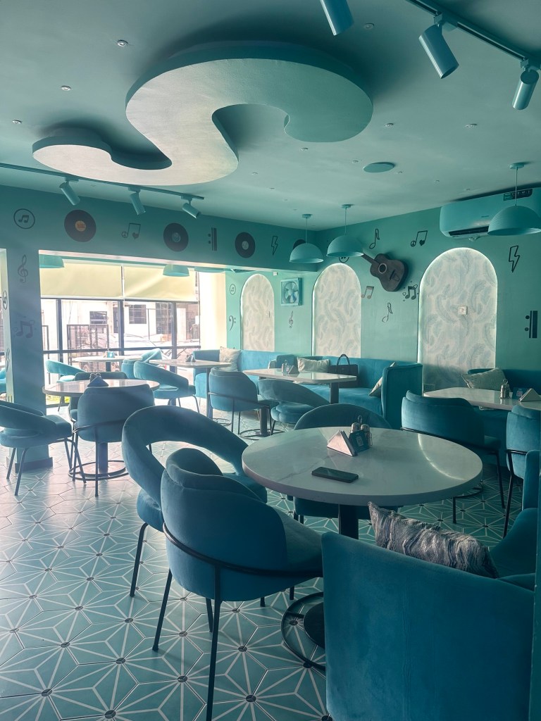 The diner occupies three different floors and is aesthetically decorated with music notes and quotes and blue and soft pink-toned furniture. The ground floor has a basic vibe setting with single and booth seats. The first floor is more relaxed and playful, with bench seats, stools, and single seats, while the second floor has a bar vibe.