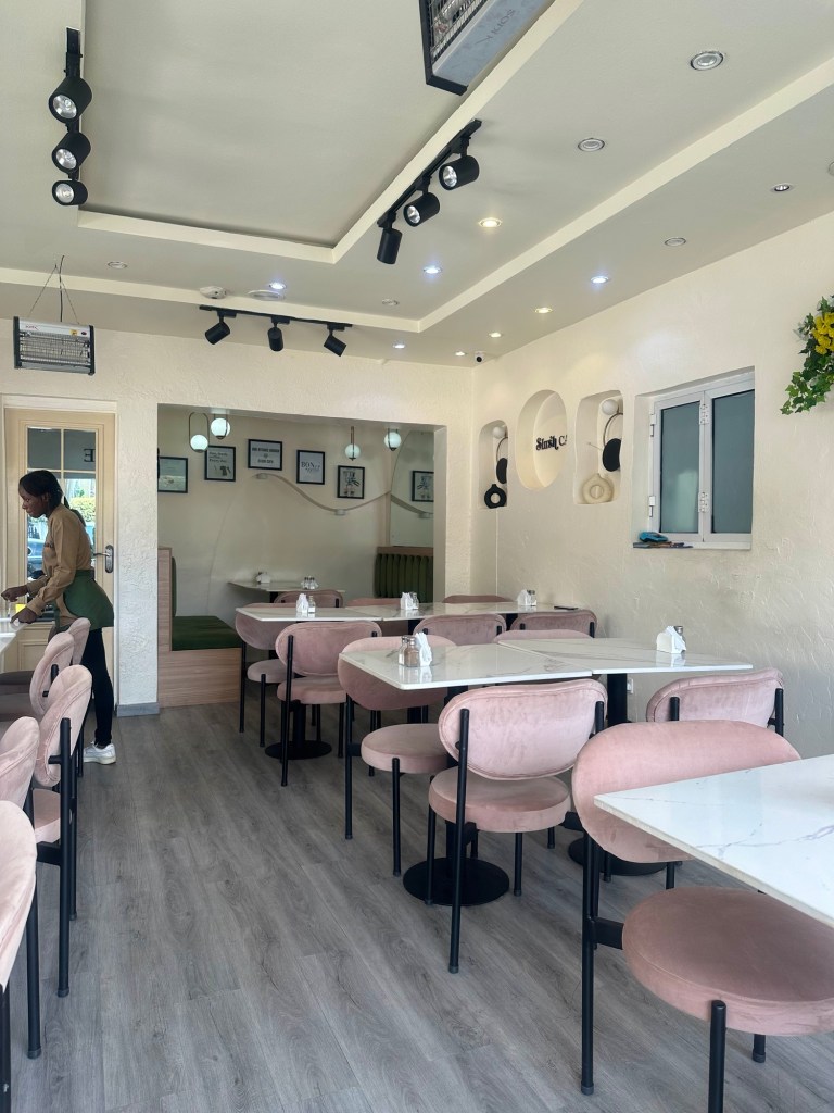 The restaurant is a small and cosy space located in a mall. The furniture is minimalist with blush, black, brown, and green tones, and the decor is aesthetically pleasing. A lot was done to make the space beautiful.