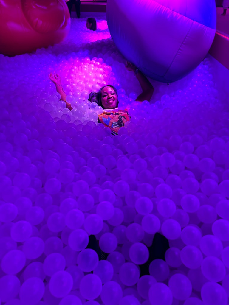 When we arrived, our tickets were checked, and we were directed to the start of the experience. Everything was dreamy in shades of pink and purple. Each room had a different exhibition on display, and we kept getting wowed as we continued our journey. The Bubble Ocean, the second exhibition, made us feel like kids again. We played with big pink balloons and took pictures and videos. Next up were The Sphere and Giant Bubble, which we moved by quickly.
