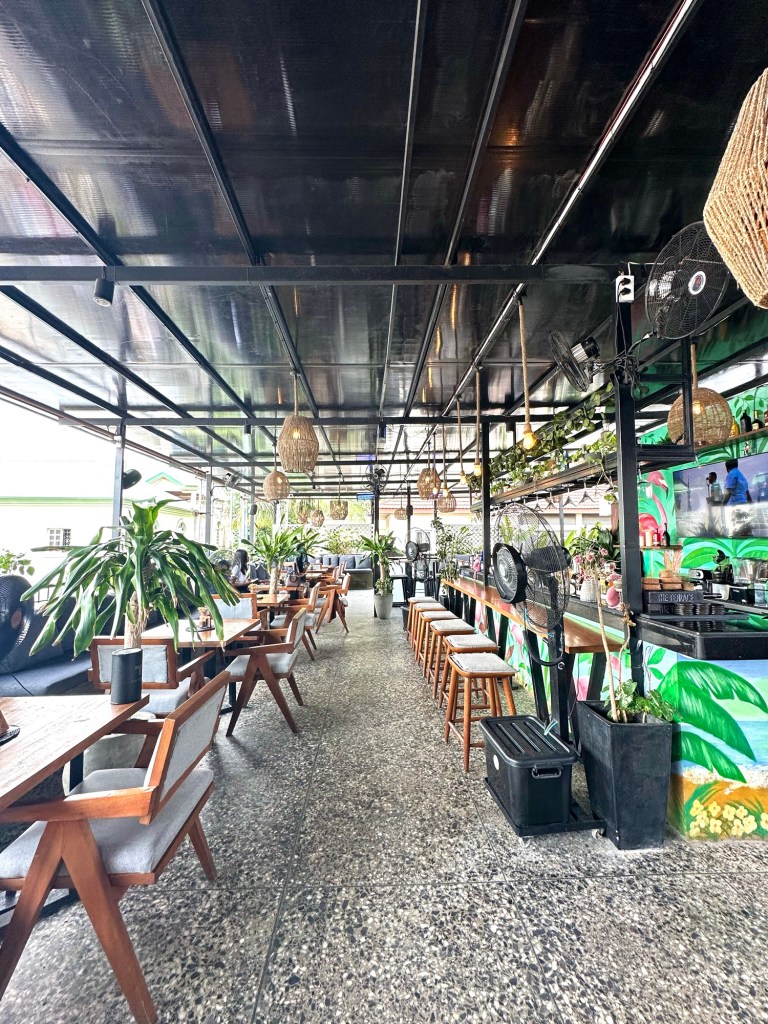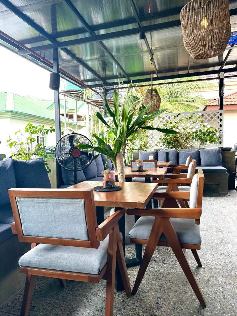 The restaurant is located on a terrace behind a building. It’s bright and vibrant, with nude-coloured furniture, minimalist light fittings, and a lot of greenery.