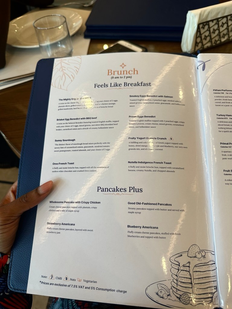 I asked for an Aperol Spritz, Olumide opted for Hot chocolate, and Osoba chose a Cappuccino. We also asked for a bottle of water for the table. For food, I chose a meal from the healthy haven category: a Grilled Roman Chicken Sandwich. Olumide chose Wholesome Pancakes with Crispy Chicken, while Osoba chose the Steamy Turkey Coconut meal but switched the coconut rice to jollof rice.