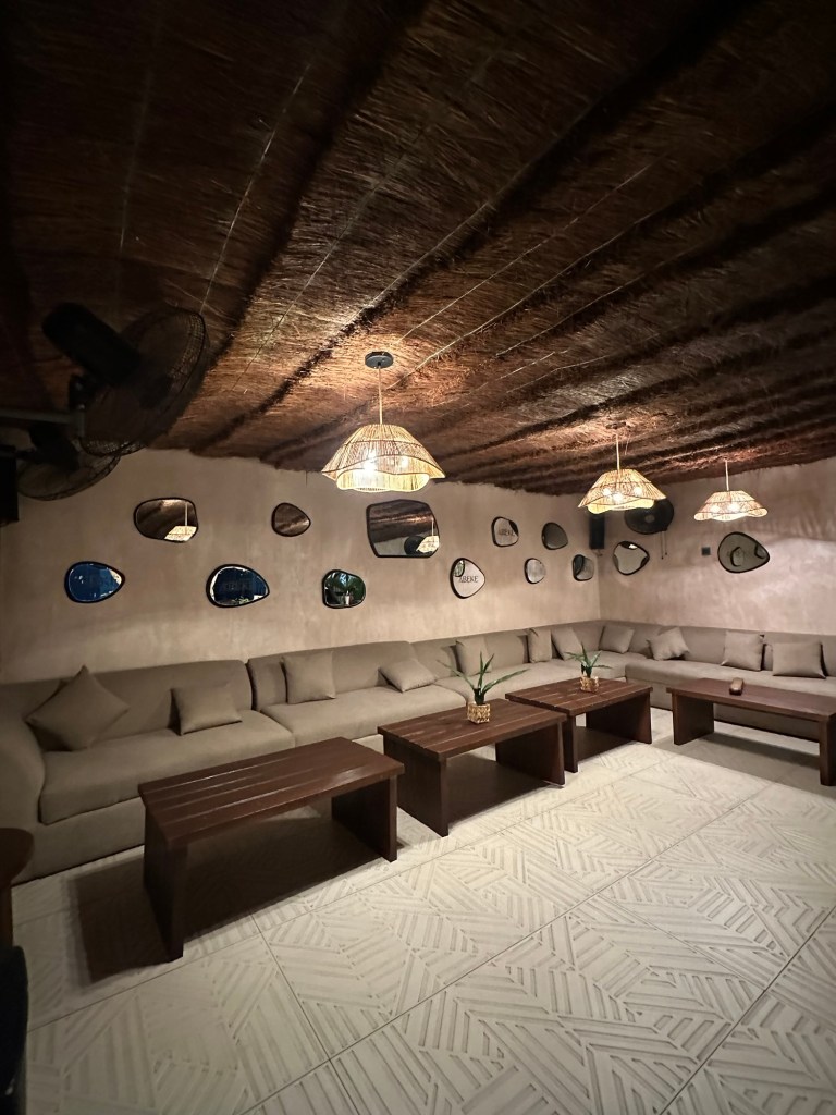 The restaurant has an ancient and traditional theme, evident in the wall finishes, decor, and furniture. The rattan-woven chairs, table mats, light fittings, mirrors and ceiling design contribute to this aesthetic. The colour palette consists of beige, grey, and brown, complemented by greenery that adds vibrancy to the space. The tables have games as centre pieces, adding a unique touch for their guests. It almost feels as if you’ve been transported to a local restaurant, or bukka, in a village in the southwestern part of Nigeria.