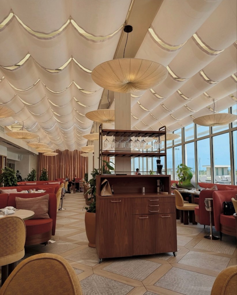 The restaurant is situated on the ground floor of an apartment building, similar to other establishments in Victoria Island. As you walk in, it feels bright and lively, adorned in shades of brown and beige that characterise the furniture and decor. I particularly admire the mushroom light fixtures; they are simple yet distinctive, transforming the entire space. The seating arrangement is extensive, offering both booths and single seating options, as well as high stools at the bar. Additionally, there is an outdoor seating area by the poolside, which creates a truly dreamy atmosphere.