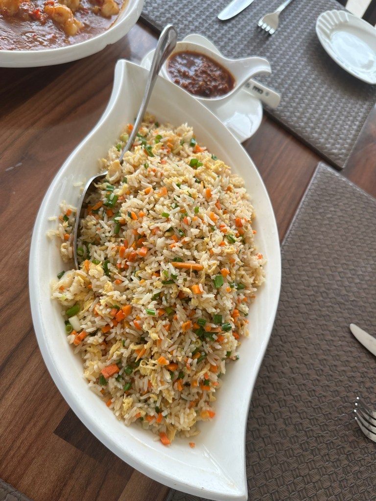Our food arrived hot about 30 minutes later, and it didn’t disappoint. The seafood rice and prawns were delicious, and the vegetables (though not Sam’s favourite) paired beautifully with both. I enjoyed them so much that I went back for seconds and even asked the waiter to pack up the rest of the veggies for me to take home.