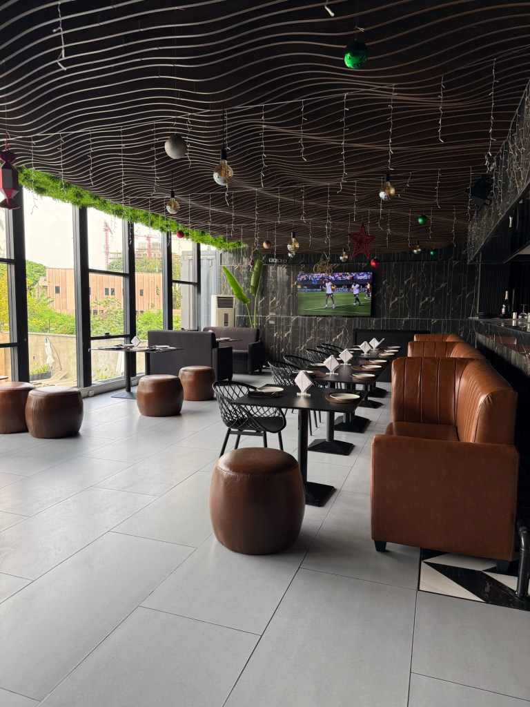 From the outside (before you drive in), you wouldn’t guess what’s happening inside. The entrance leads into a full complex — not just a restaurant, but a shopping area with a football pitch and a swimming pool. The restaurant itself has a cool, low-key vibe. Still, from the look and feel of the lounge upstairs, I could tell the place likely transforms into something livelier at night.