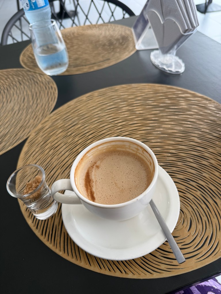 For drinks, I ordered a café latte and water, while my uncle ordered water. For food, we both ended up choosing salads — I went for the Avocado & Shrimp Salad, and he chose the Salmon Salad.