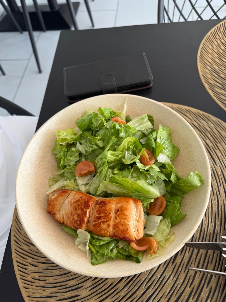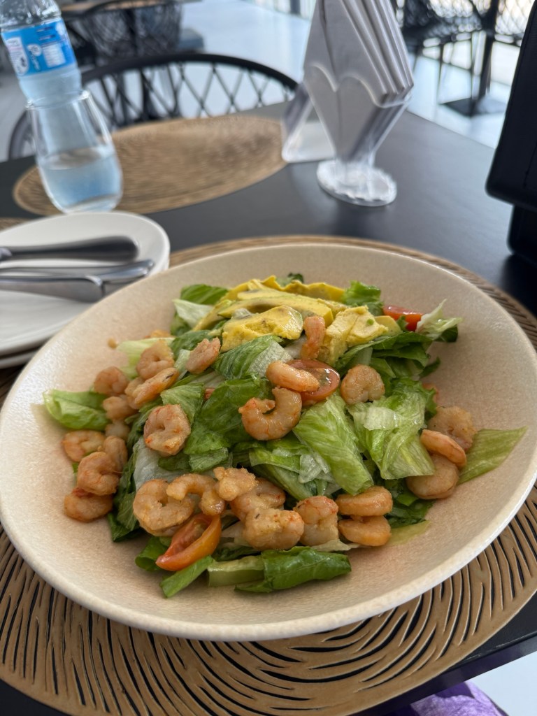 The lettuce tasted like it had been dipped lightly in olive oil — a nice, unexpected twist. Thankfully, we didn’t mind it. The portions of shrimp and salmon were generous, and overall, the salads were decent.